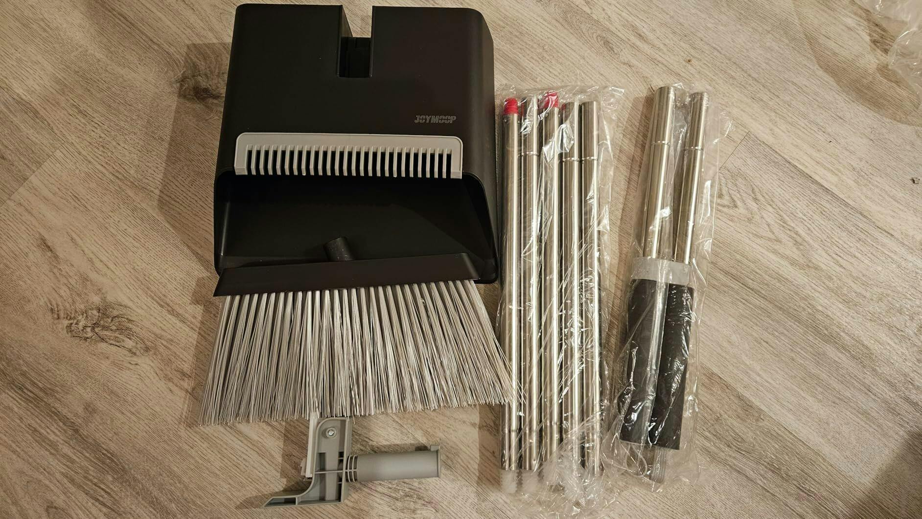 Angela This broom and dustpan set is exactly what I needed! The bristles are firm and slightly stiff, which makes it easy to sweep up dust, crumbs, and even stubborn debris from the floor. The broom handle is extended, so I don’t have to bend over while sweeping—much more comfortable to use. The added stiffness gives it better control and power, especially on rougher surfaces. The dustpan clips on securely and the rubber edge helps collect everything in one go. Great value and thoughtful design!